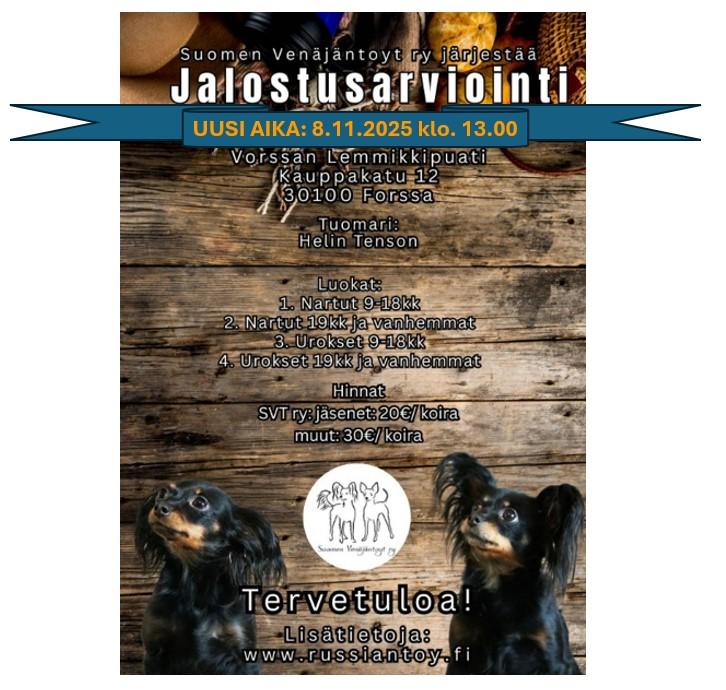 Uusi aika jalostusarvionnille on 8.11.2025 kello 13.00. Paikka pysyy samana (Kauppakatu 12, Forssa). Mikäli olet jo aiemmin ilmoittautunut, ei sinun tarvitse uudelleen täyttää ilmoittautumislomaketta. Mikäli aika ei sovi, peruuta kuitenkin ilmoittautumisesi ilmoittamalla siitä yhdistyksen sähköpostiin: yhdistys.russiantoy@gmail.com Maksamme sinulle tässä tapauksessa ilmoittautumismaksusi takaisin.